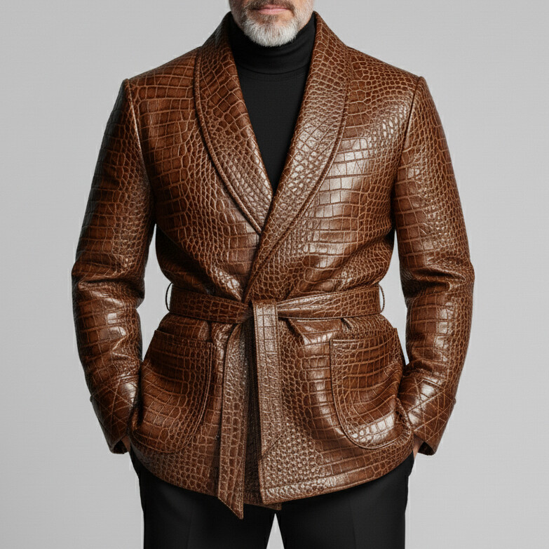 Men's Brown Crocodile PU Leather Shawl Lapel Long Sleeve Pocket Belt Blazer