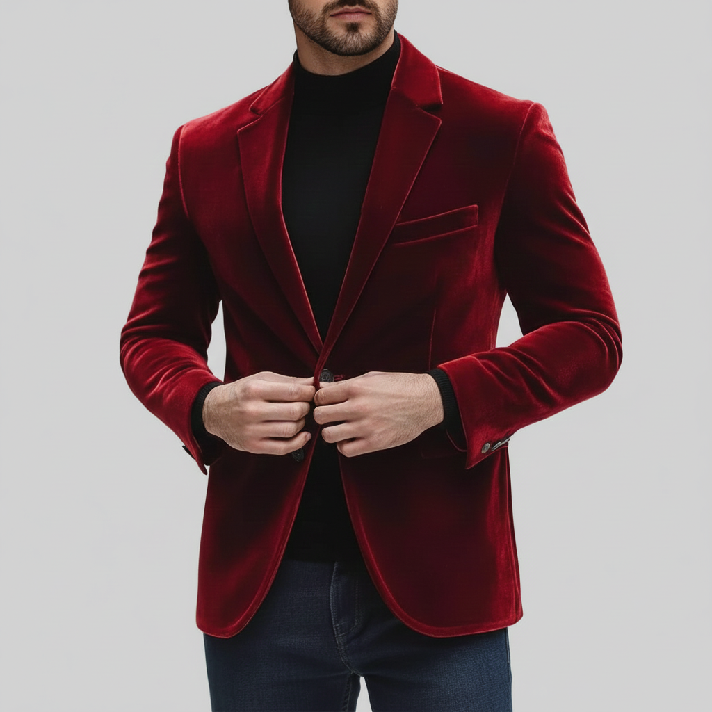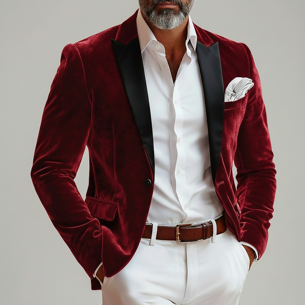 Men's Red Contrast Peaked Lapel One Button Long Sleeve Chest Pocket Velvet Blazer