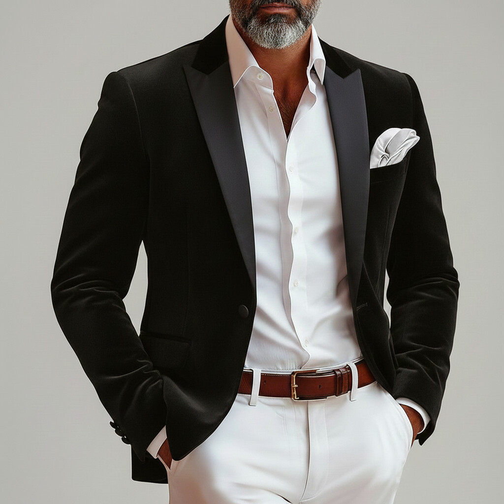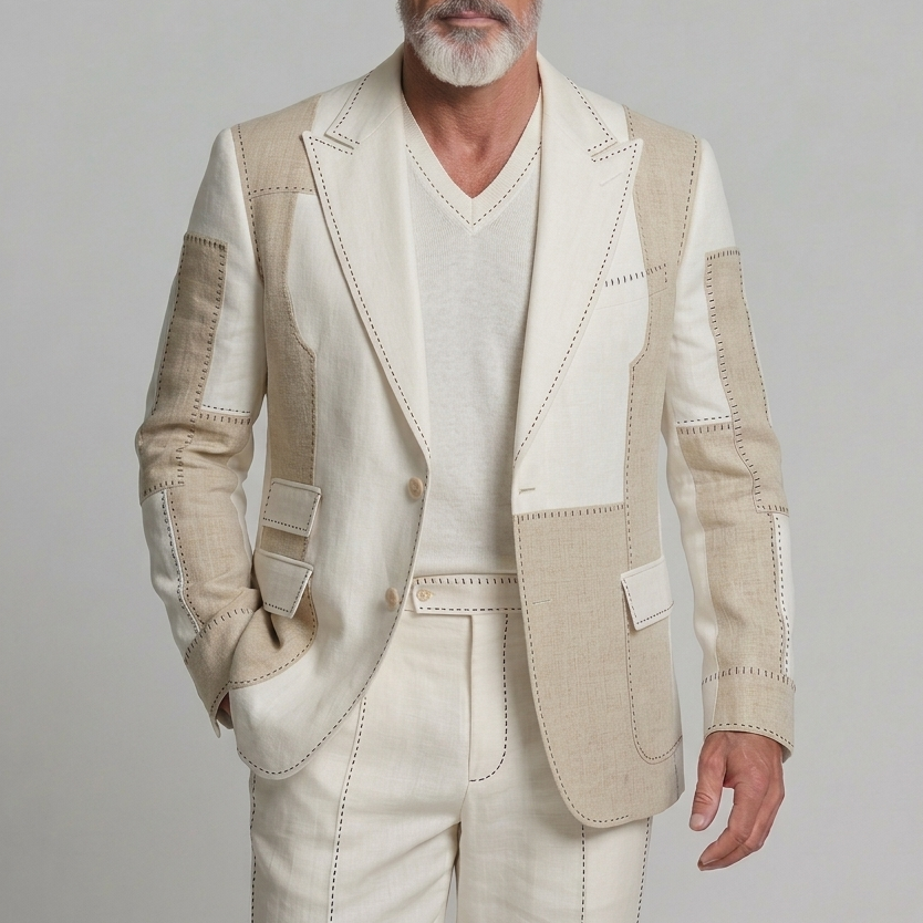 Men's Business Casual Ivory Peak Lapel Top Stitch Design Colorblock Linen Long Sleeve Blazer