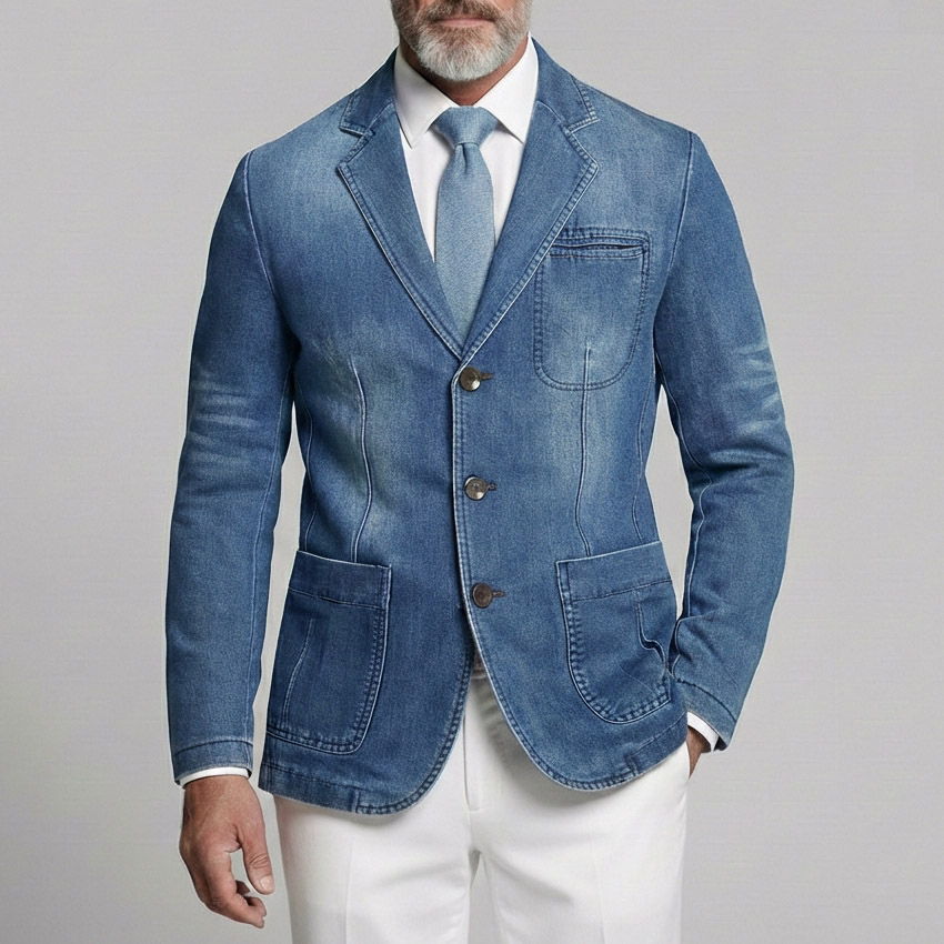 Men's Business Casual Denim Notched Lapel Single Breasted Pocket Long Sleeve Blazer