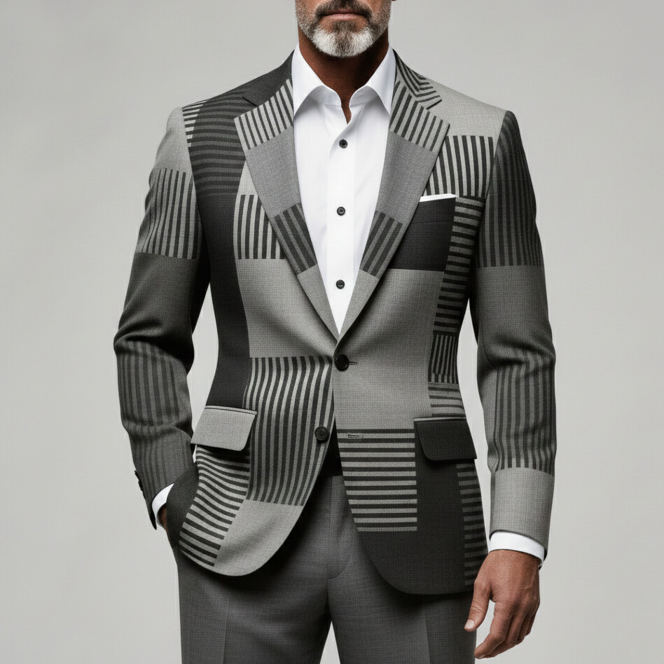 [Pre-Order] Men's Gray Striped Colorblock Notched Lapel Chest Pocket Single Breasted Long Sleeve Blazers