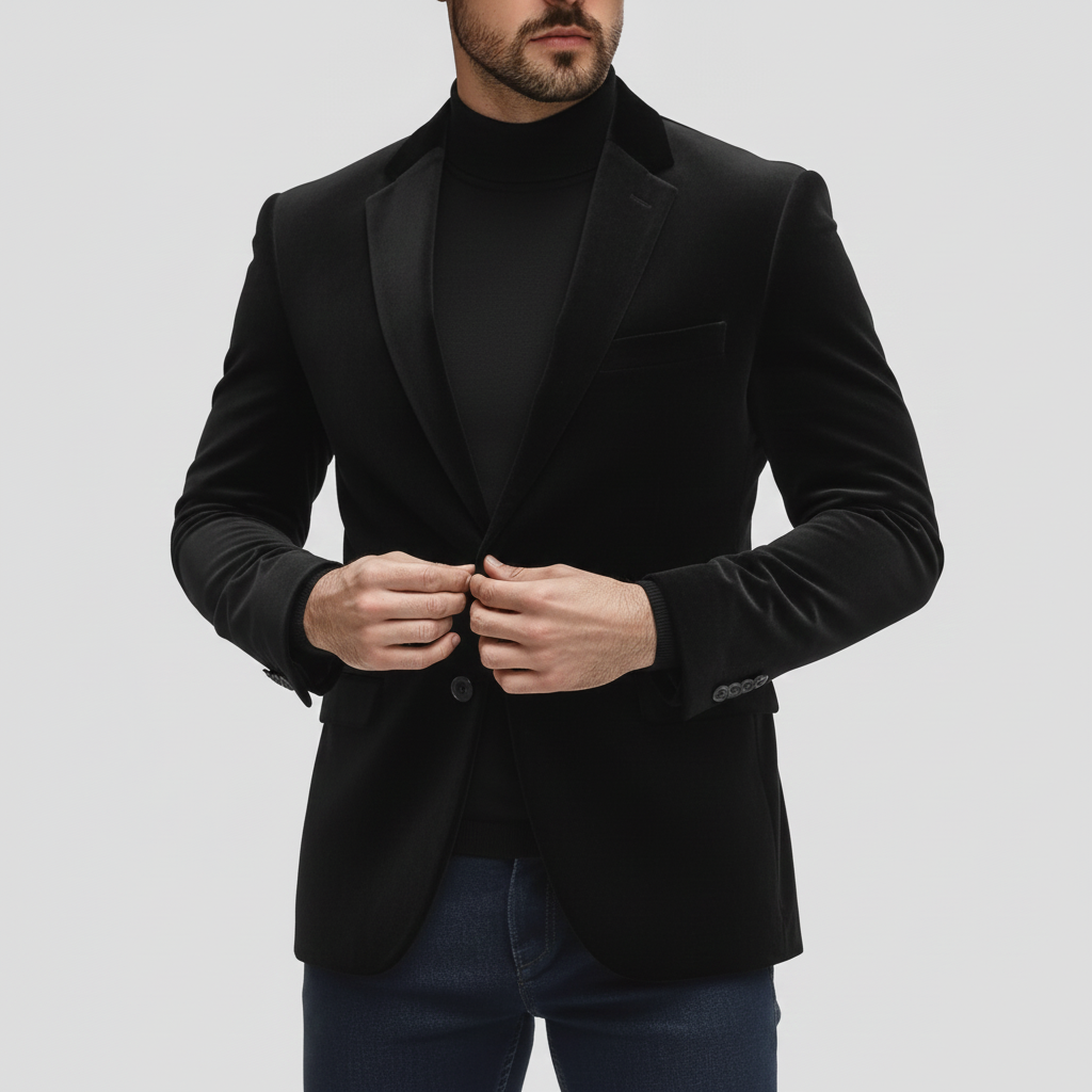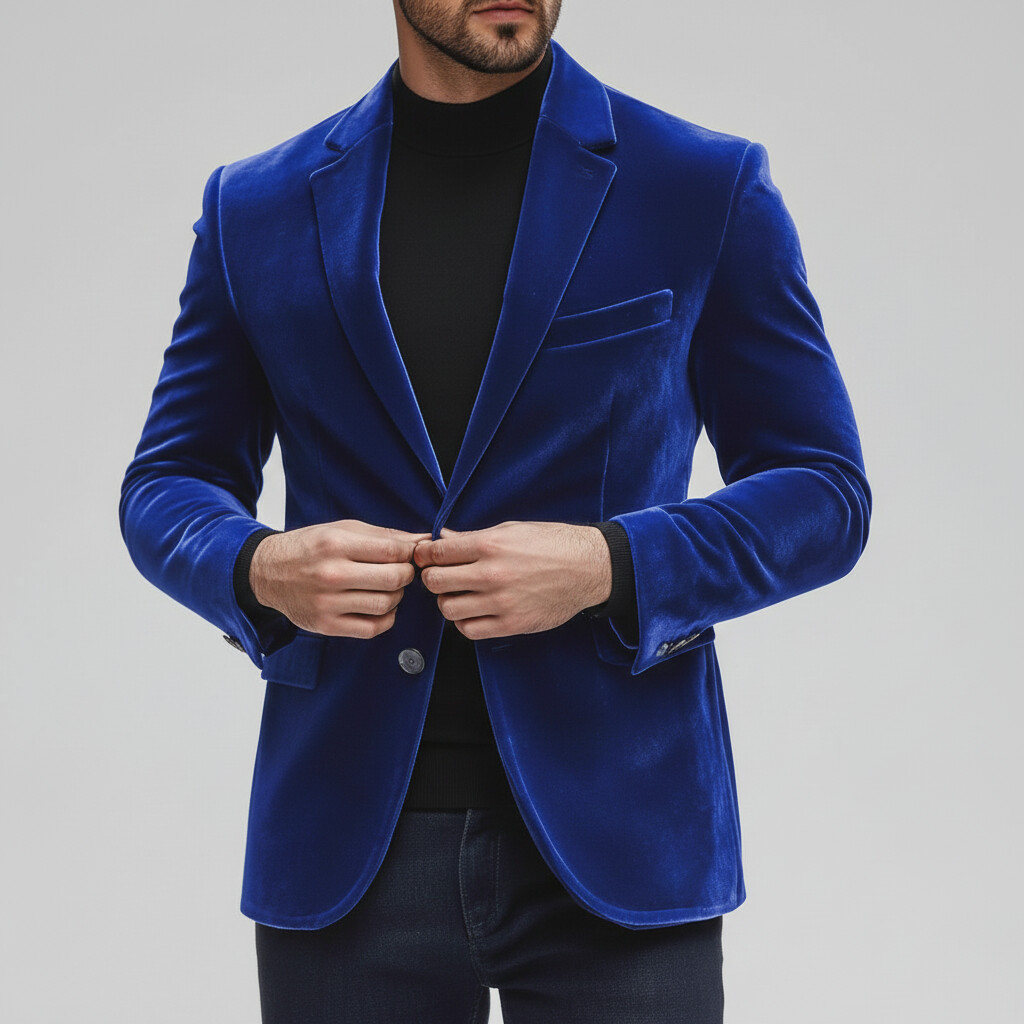 Men's Evening Blue Notch Lapel One Button Long Sleeve Velvet Blazer