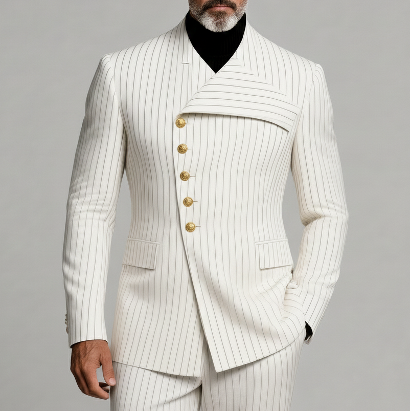 Men's Business Striped White Asymmetrical Collar Single Breasted Long Sleeve Blazers