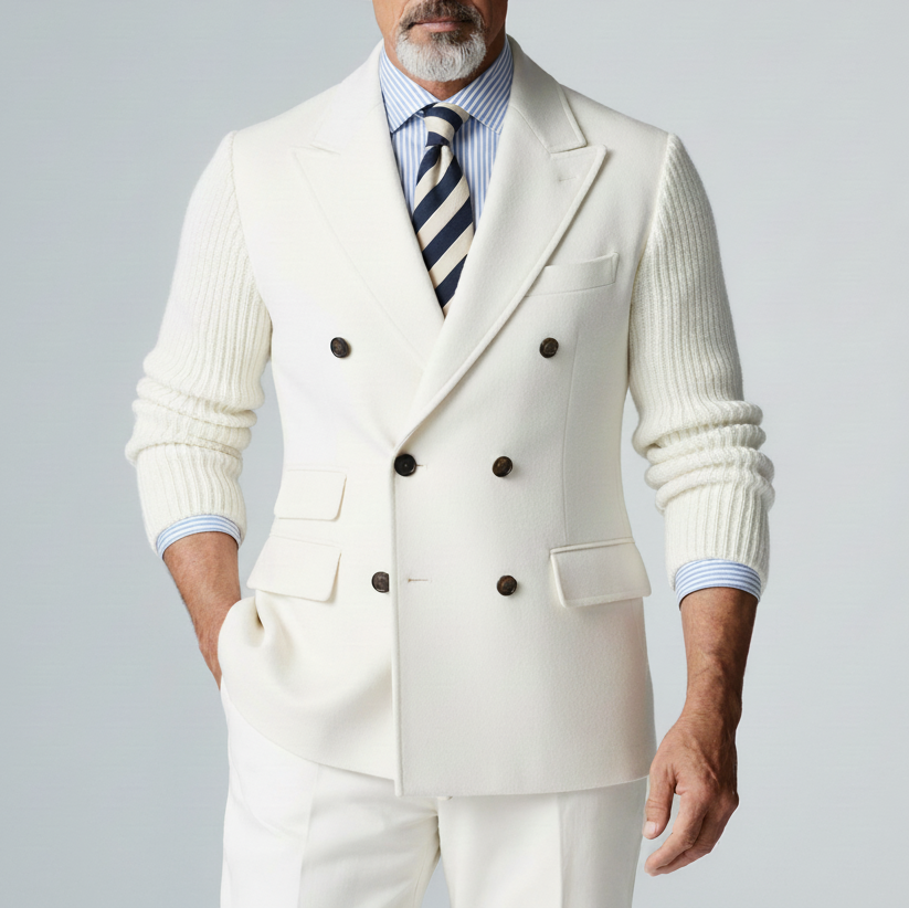 Men's White Peak Lapel Knitted Long Sleeve Double Breasted Blazer