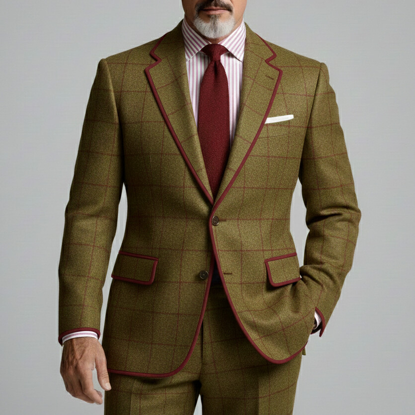 [Pre-Order] Men's Olive Green Contrast Color Plaid Notched Lapel Single Breasted Long Sleeve Blazers