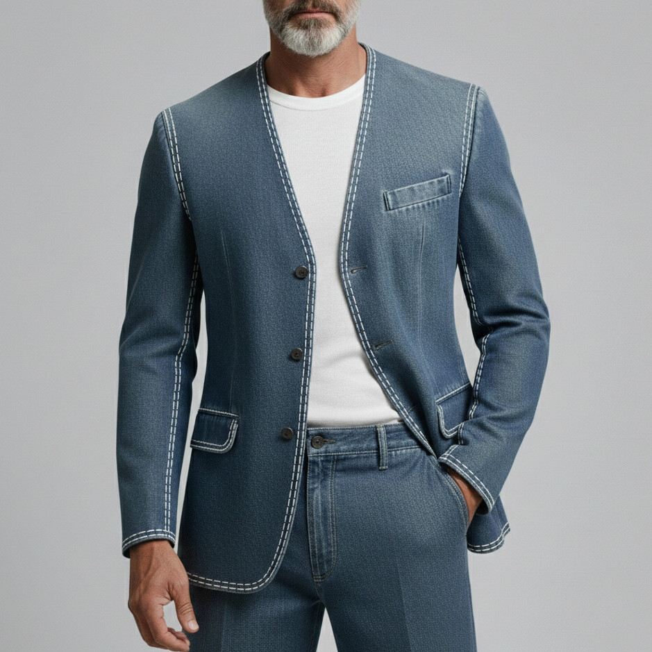 Men's Casual Washed Denim Collarless Long Sleeve Single Breasted Jacket