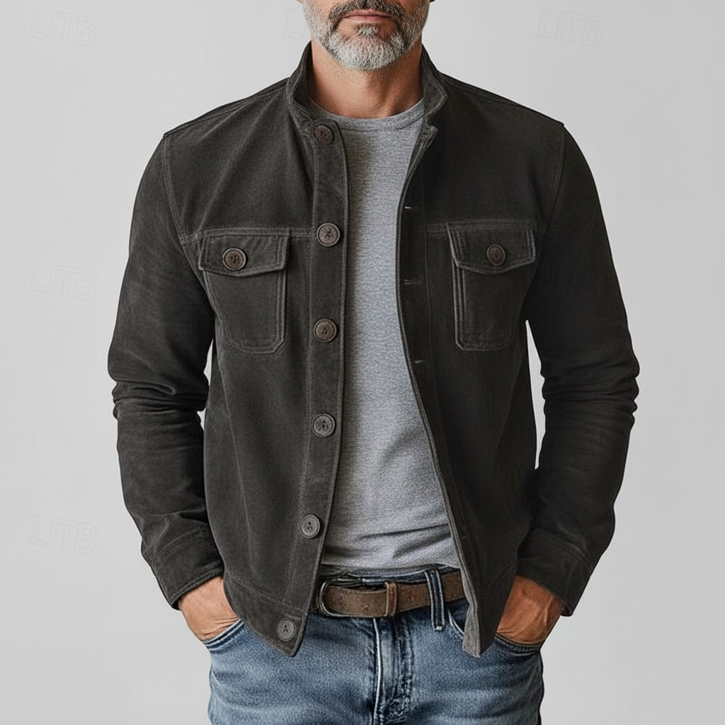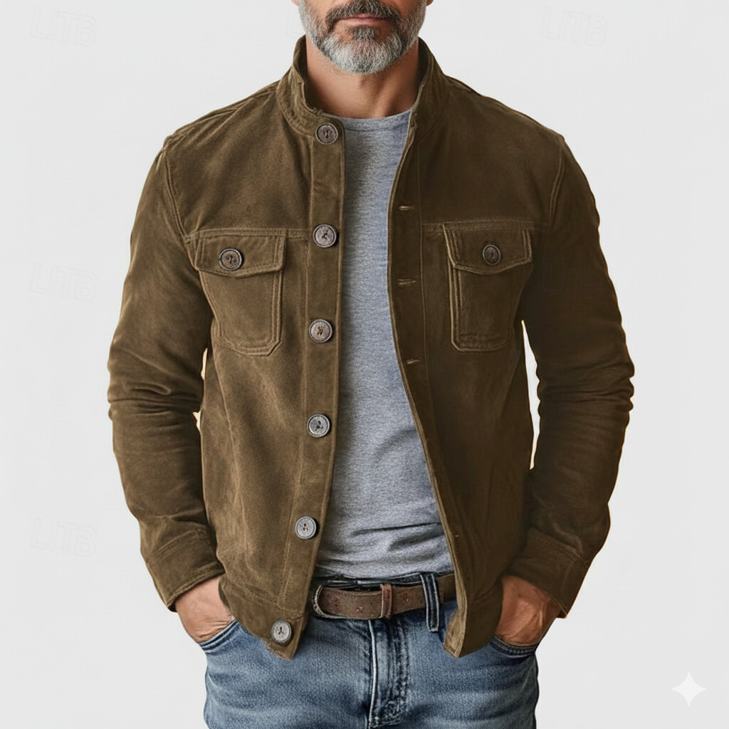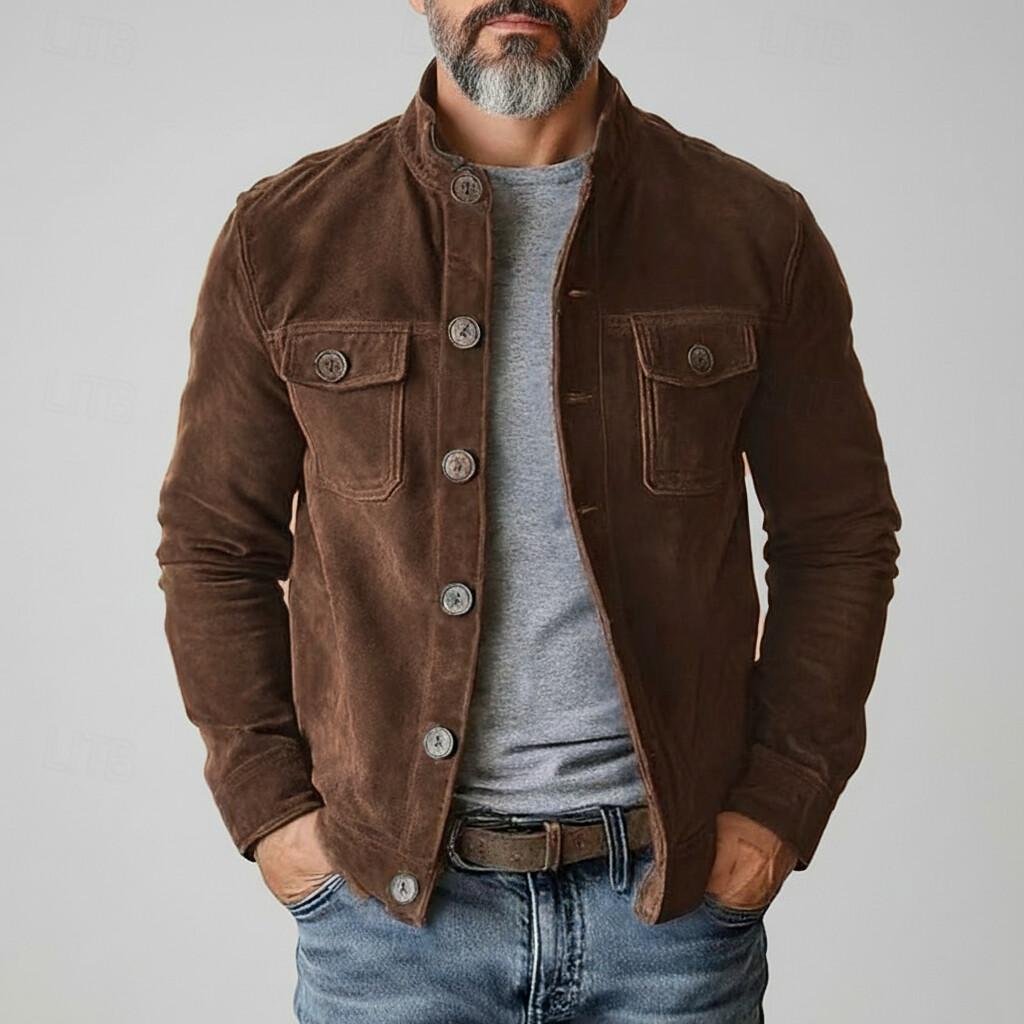 Men's Utility Solid Suede Stand Collar Pockets Single Breasted Long Sleeve Jacket