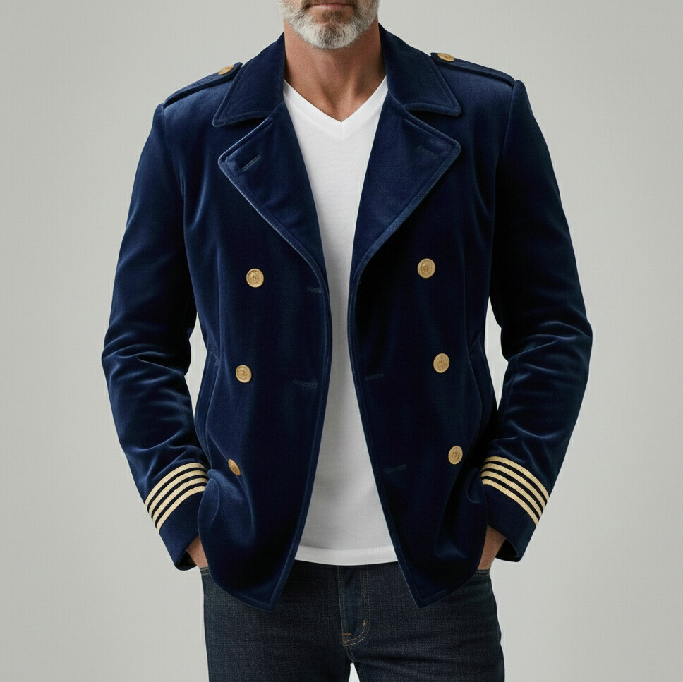 [Pre-Order] Men's Navy Blue Velvet Lapel Collar Double Breasted Pocket Striped Cuff Long Sleeve Jacket