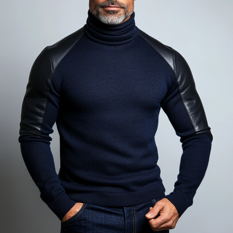 Men's Knit Patchwork PU Leather Long Sleeve Turtleneck Sweater