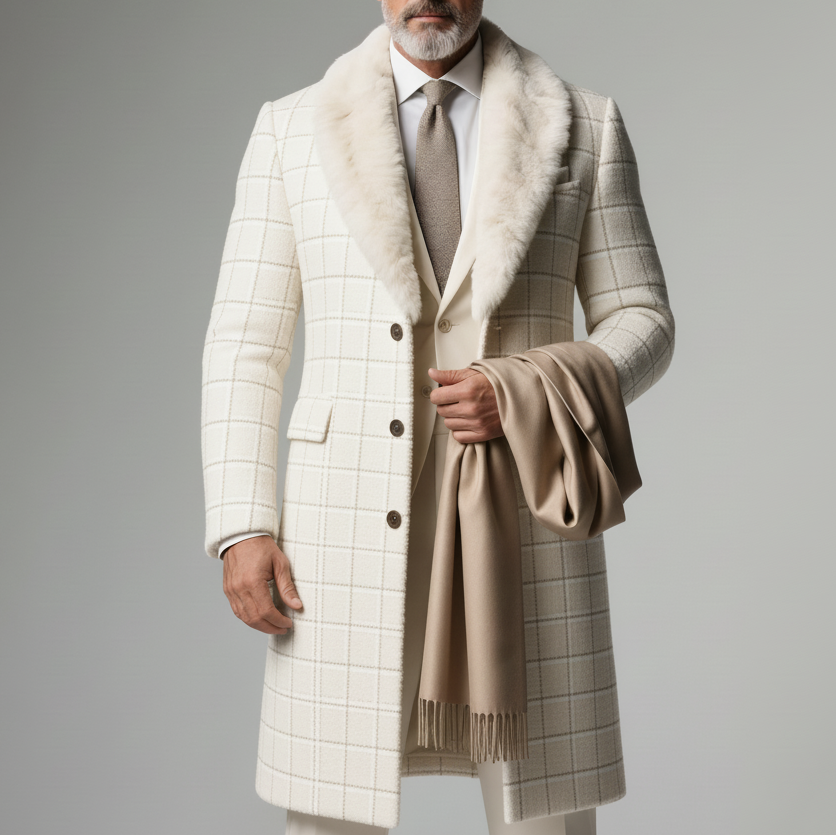 Men's Business Beige Fur Lapel Single Breasted Long Sleeve Plaid Print Trench Coats
