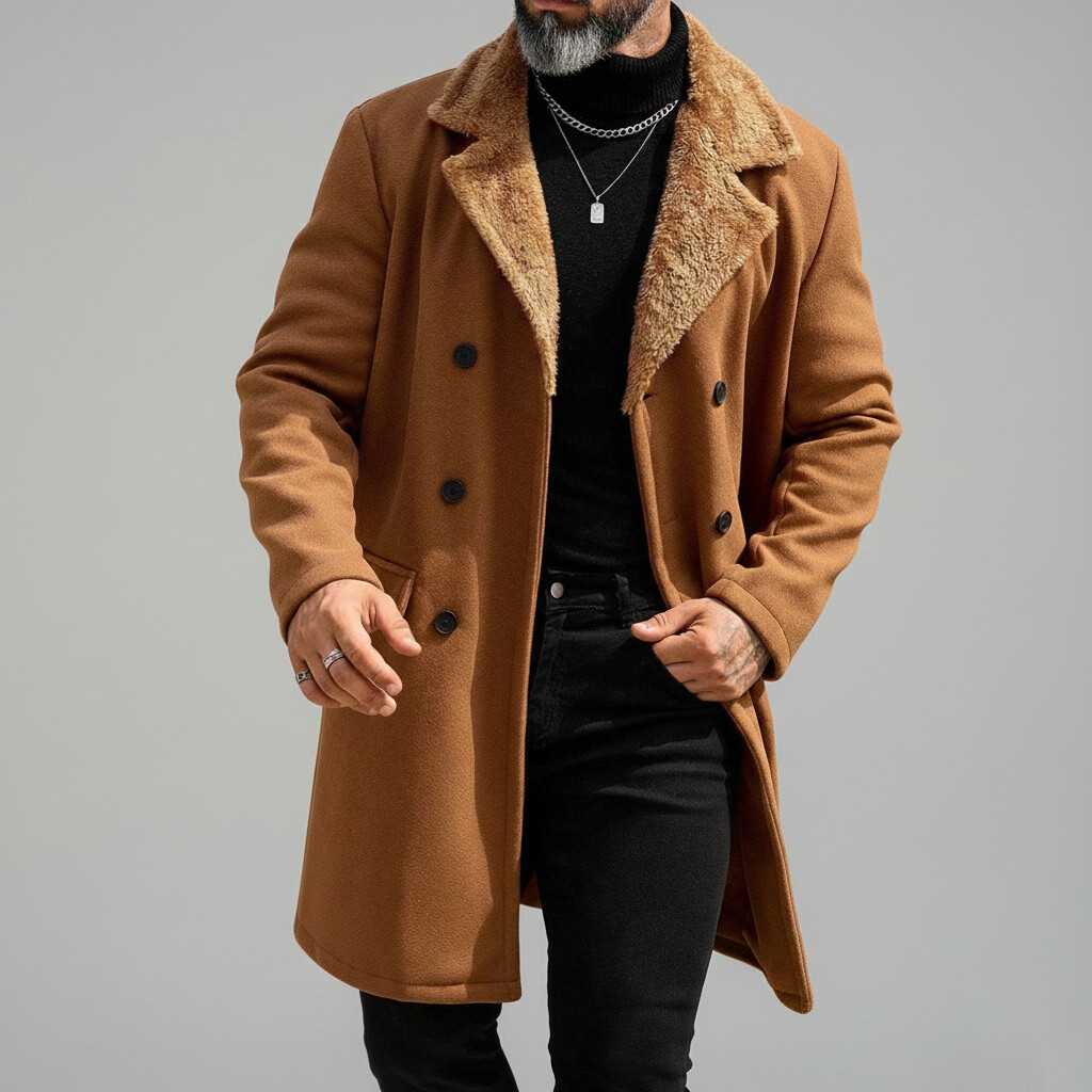 Men's Brown Fuzzy Notch Lapel Double Breasted Long Sleeve Sherpa-Lined Trench Coats